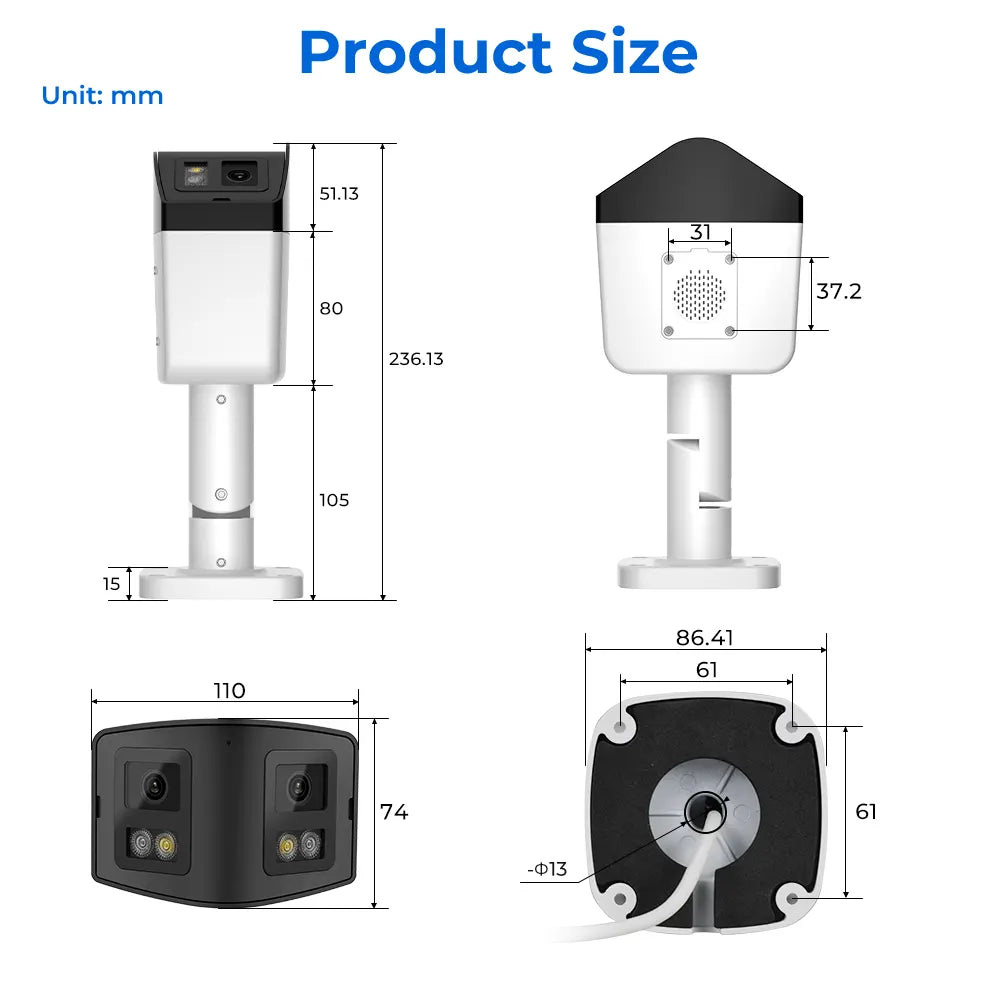 Equipped with two 2.8mm lenses and dual 1/2.7" CMOS sensors, this dual lens security camera captures a seamless 180° horizontal field of view in stunning 8MP clarity. Say goodbye to blind spots with complete area coverage in a single frame.
