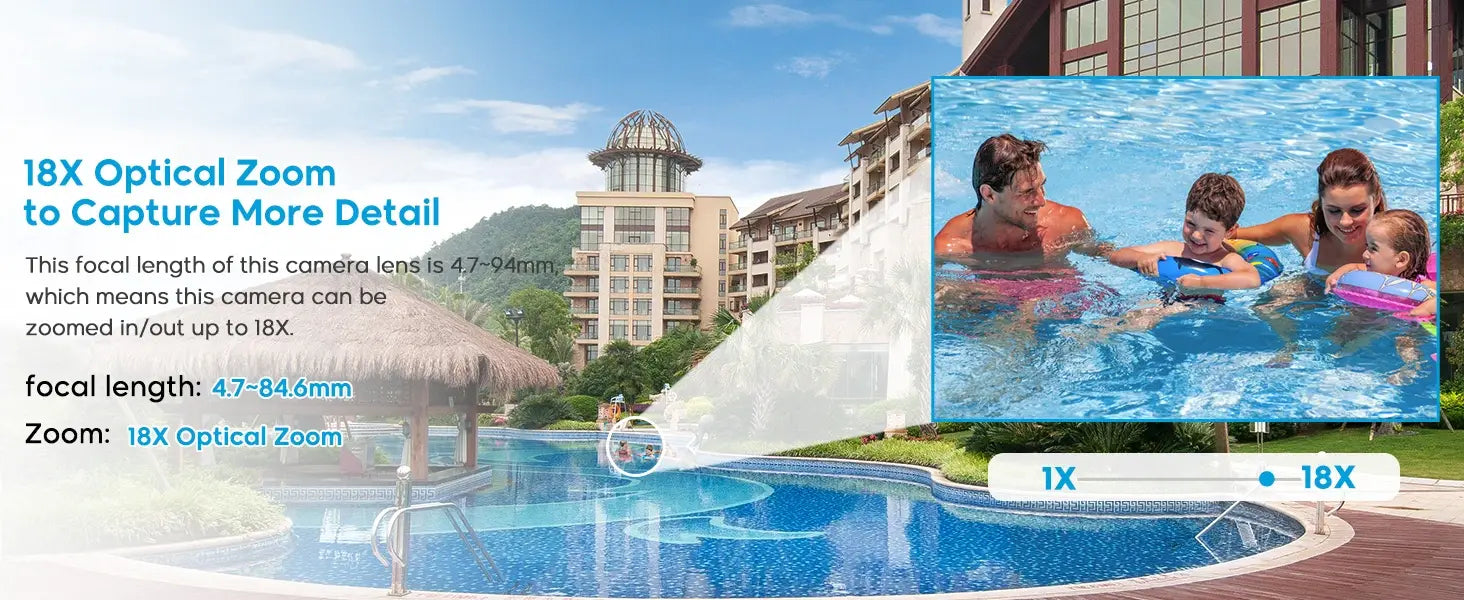 Equipped with a 4.7–84.6 mm motorized lens, this ptz security camera outdoor offers 18× optical plus 30× digital zoom for pinpoint target identification.